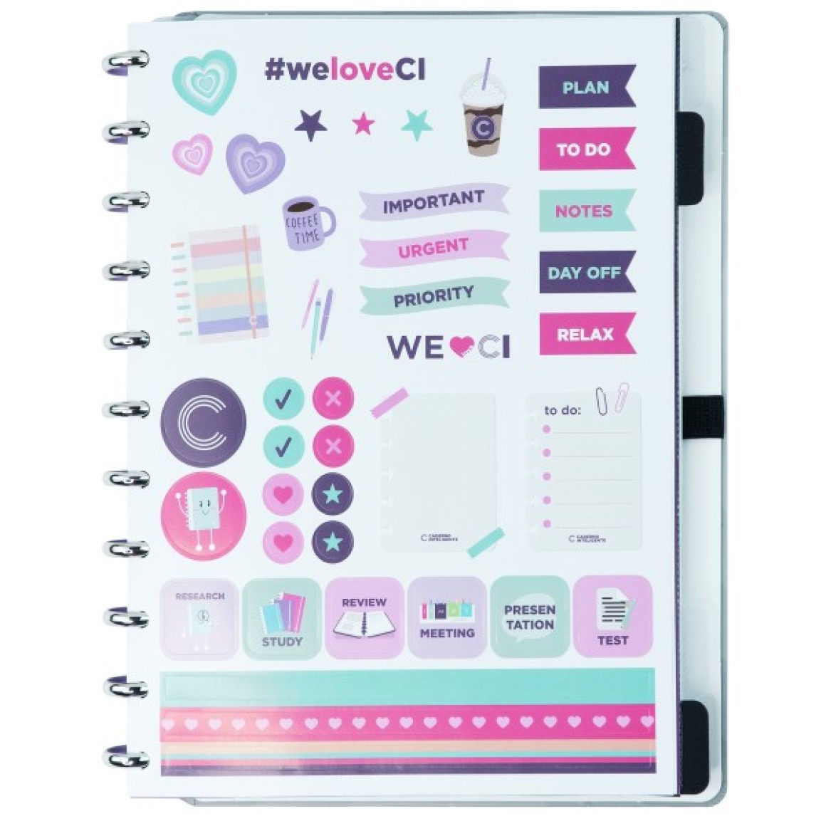 ? Inteligine: Capa e contracapa rígidas, 01 folha de adesivos, 01 folha de instrução de uso e manuseio, com refis e acessórios da marca disponíveis no verso, 01 folha de identificação com calendário no verso, 50 folhas Lisas Offset 120g e 01 suporte com elástico para 01 caneta ou 01 lápis.