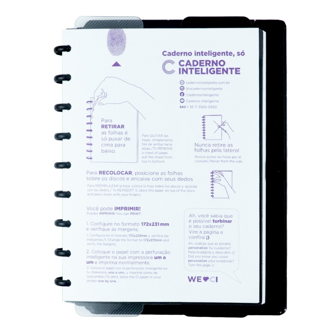 ? Grande: Capa e contracapa rígidas, 01 bolsa plástica, 01 folha de instrução de uso e manuseio, com refis e acessórios da marca disponíveis no verso, 01 folha de identificação com calendário no verso, 04 divisórias com abas para identificação (02 pretas e 02 transparentes), 80 folhas offset 90g (60 folhas pautadas e 20 folhas lisas brancas para impressão), 01 suporte com elástico para 01 caneta ou 01 lápis e discos M + elástico.