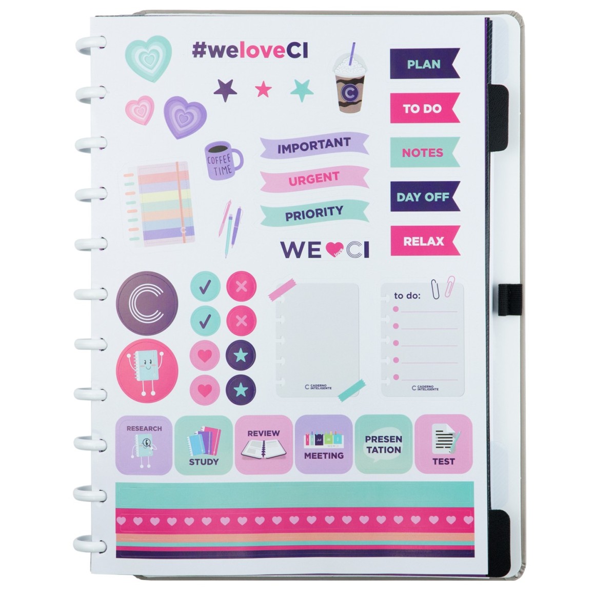 ? Inteligine: Capa e contracapa rígidas, 01 folha de adesivos, 01 folha de instrução de uso e manuseio, com refis e acessórios da marca disponíveis no verso, 01 folha de identificação com calendário no verso, 50 folhas Lisas Offset 120g e 01 suporte com elástico para 01 caneta ou 01 lápis.