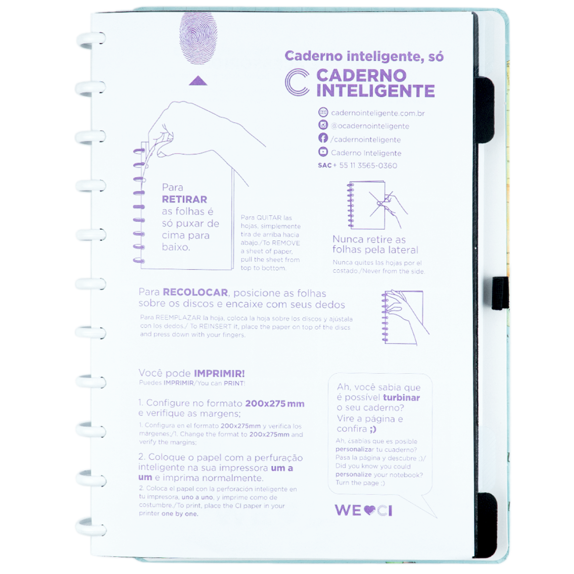 Disponível nos tamanhos Grande e A5 e com acabamento em verniz localizado, ele é ideal para uso escolar, como um caderno de anotações e também como um planner. Com o incrível sistema de discos, o Caderno Inteligente® é um caderno totalmente personalizável, que permite que você tire e adicione folhas quando quiser, adicionando muito mais versatilidade e personalidade para o seu caderno.