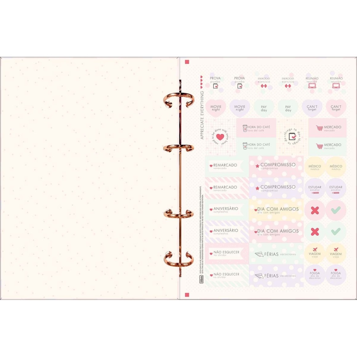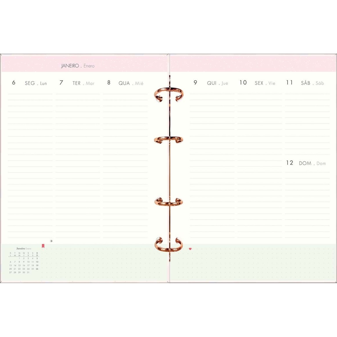 O Planner Argolado 17,7 x 24 cm Soho 90 G 2025 pode ser usado para organizar os compromissos do dia a dia em casa, no trabalho e na escola. Com formato compacto, leve e bastante funcional, tem capa dura com detalhe metalizado, folha de adesivos e bolsa plástica. O miolo deste produto conta com 88 folhas em papel creme, gramatura 90 g/m², com visões anual, mensal e semanal, além de páginas para anotações.