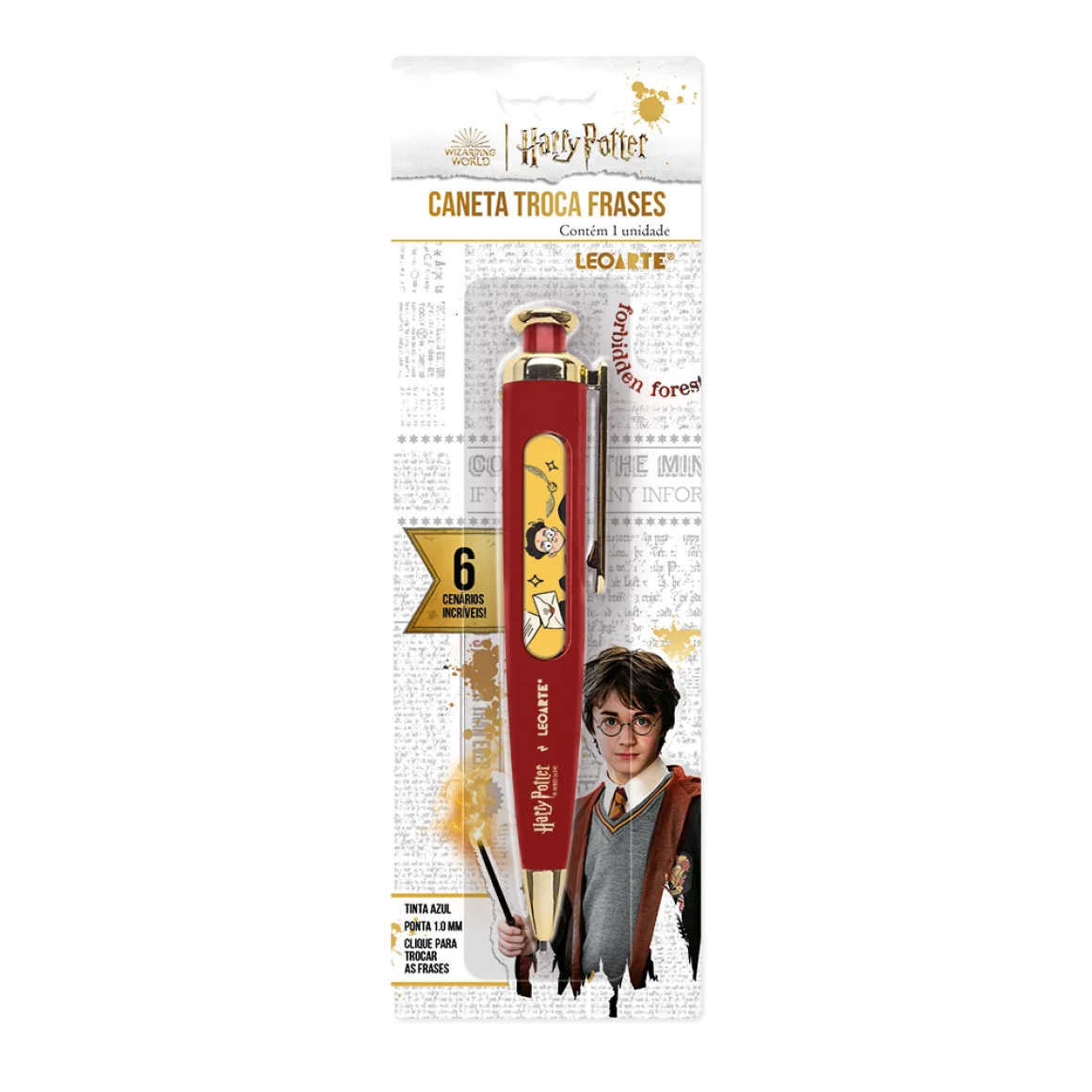 Uns tem uma varinha para os feitiços. Outros, uma caneta. Sim, a Caneta Esferográfica Troca-Frases Harry Potter LeoArte tem esse poder, já que ela vem com várias frases e imagens dos personagens.