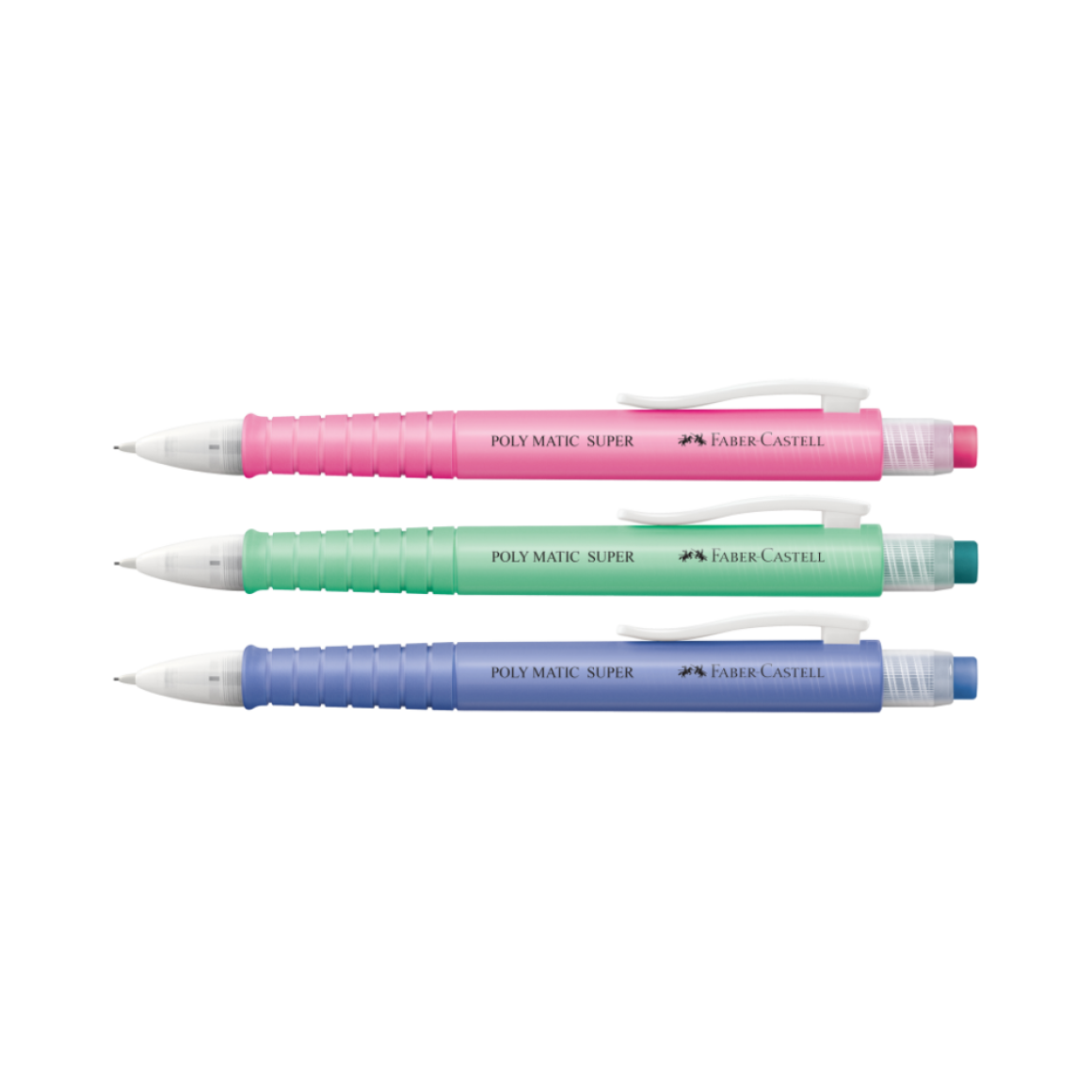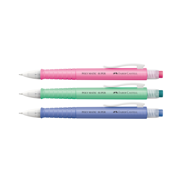 A Lapiseira Poly Matic Super da Faber-Castell possui a tecnologia Matic, que possibilita o avanço automático da mina para uma escrita contínua. Seu corpo é grosso e triangular, que proporciona maior segurança na pega. A borracha é colorida e possui sistema de extensão. Lapiseira ideal para utilizar o grafite 0.5mm.