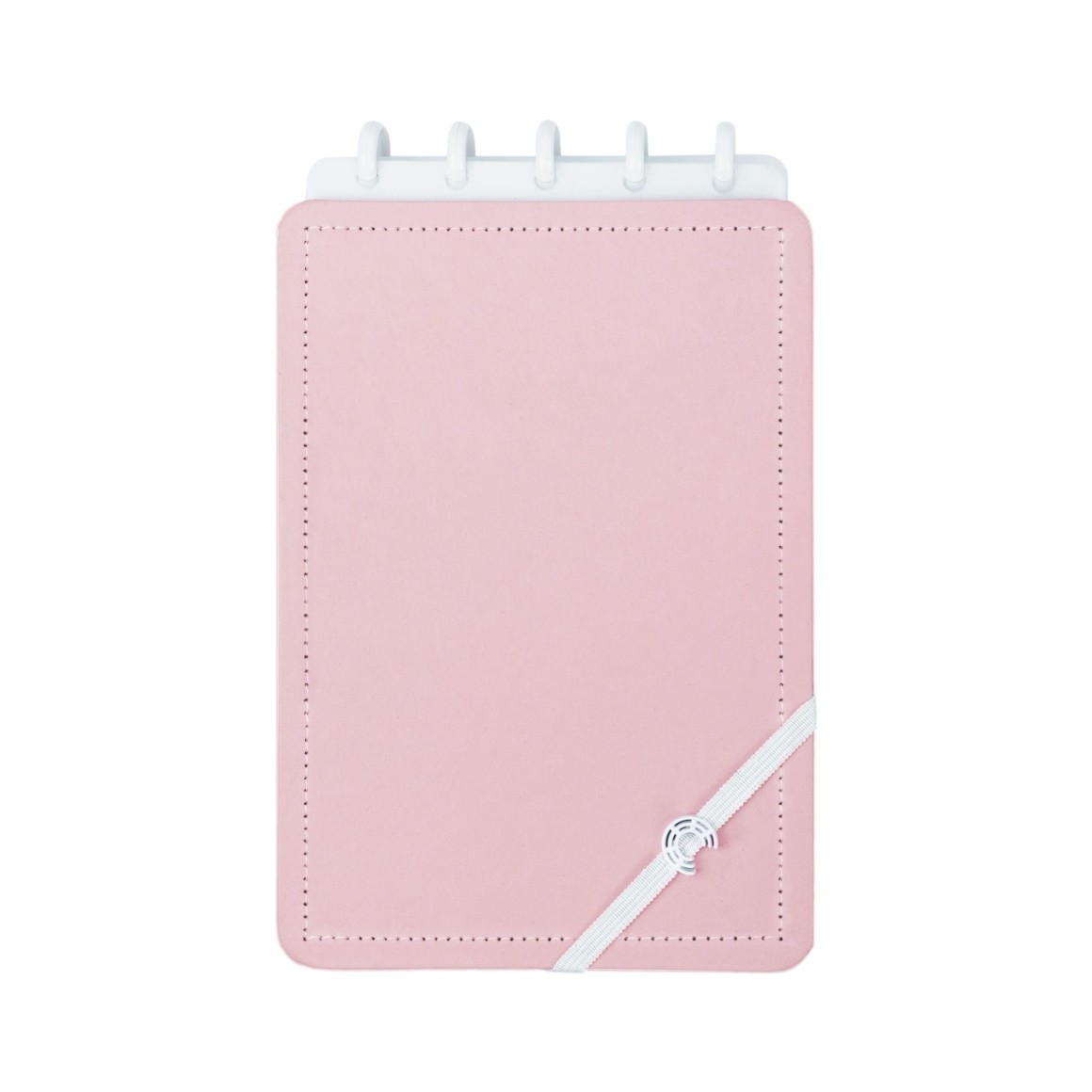 A capa rosa paastel com acabamento elegante e o elástico na transversal não só adicionam um toque de modernidade, mas também mantêm suas anotações seguras e bem organizadas.