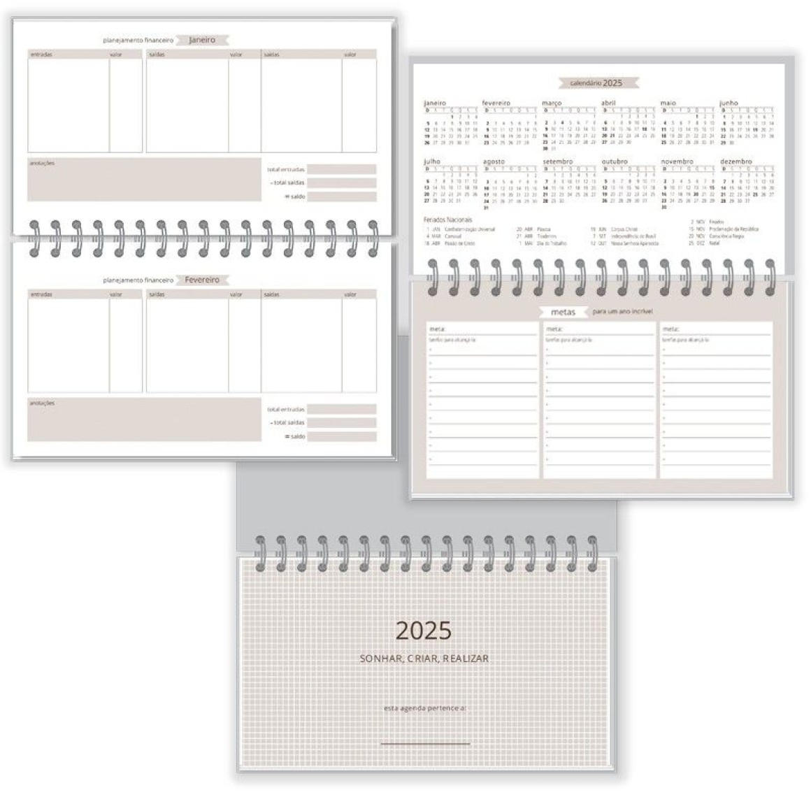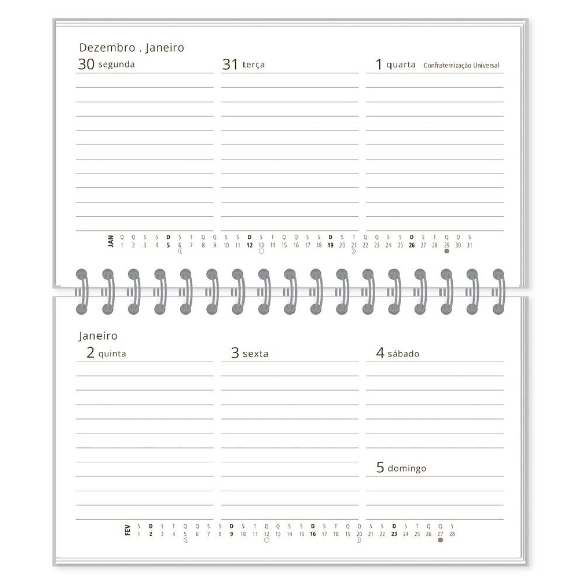 Agenda semanal, capa dura, miolo com 128 páginas (64 folhas), formato 8,5x15cm, papel offset 75g, acabamento wire-o, texto impresso em hot stamp dourado, elástico para fechamento. Acompanha marcador de páginas.