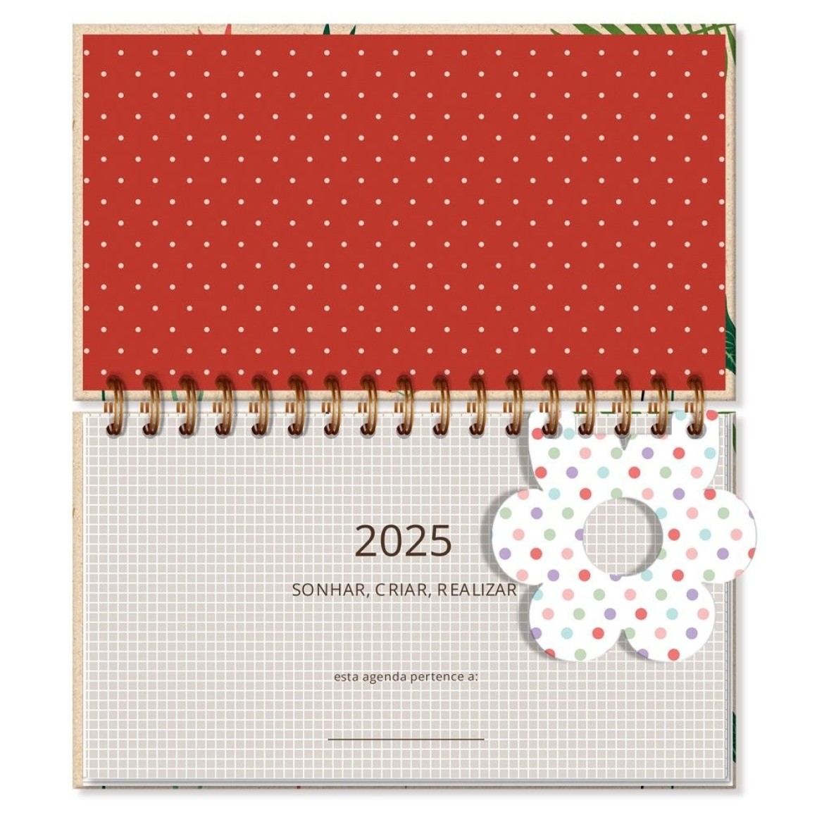 Agenda semanal, capa dura, miolo com 128 páginas (64 folhas), formato 8,5x15cm, papel offset 75g, encadernação wire-o e elástico para fechamento. Impressa em papel kraft e possui frase em hot stamp dourado. Acompanha marcador de páginas.