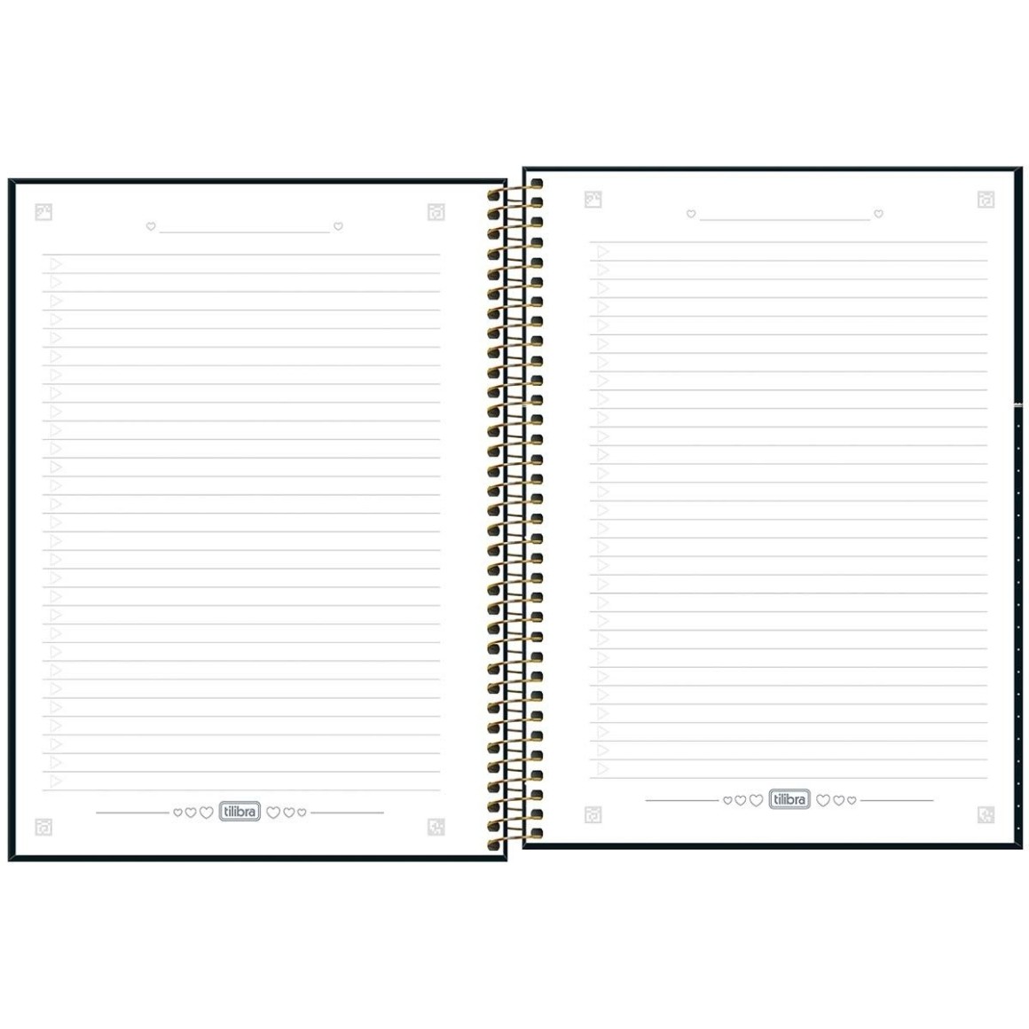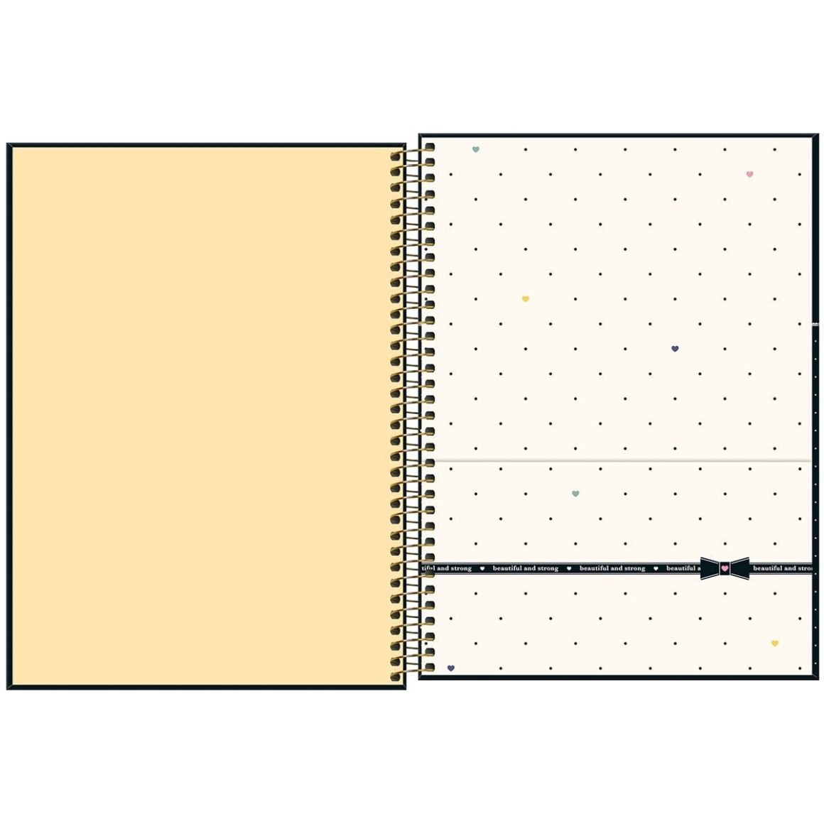 Use este modelo, com capa dura com detalhes metalizados e parte interna decorada, bolsa de papel decorada para guardar trabalhos, adesivos funcionais, folhas pautadas e espiral colorido, para anotar as aulas, fazer resumos, listar tarefas e organizar as ideias de forma prática e eficiente.