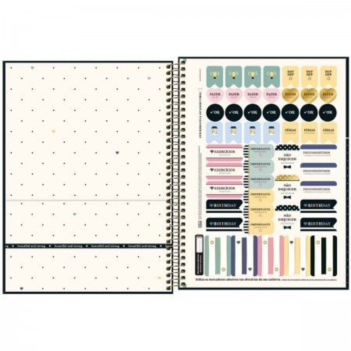 Use este modelo, com capa dura com detalhes metalizados e parte interna decorada, bolsa de papel decorada para guardar trabalhos, adesivos funcionais, folhas pautadas e espiral colorido, para anotar as aulas, fazer resumos, listar tarefas e organizar as ideias de forma prática e eficiente.