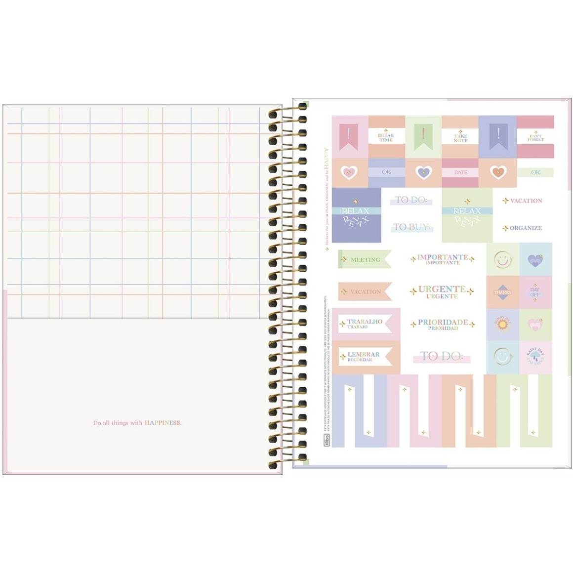 O Caderno Espiral Capa Dura Colegial 10 Matérias Happy 160 Folhas da Tilibra é perfeito para você que busca uma opção para organização da rotina de estudos com visual em cores pastel.