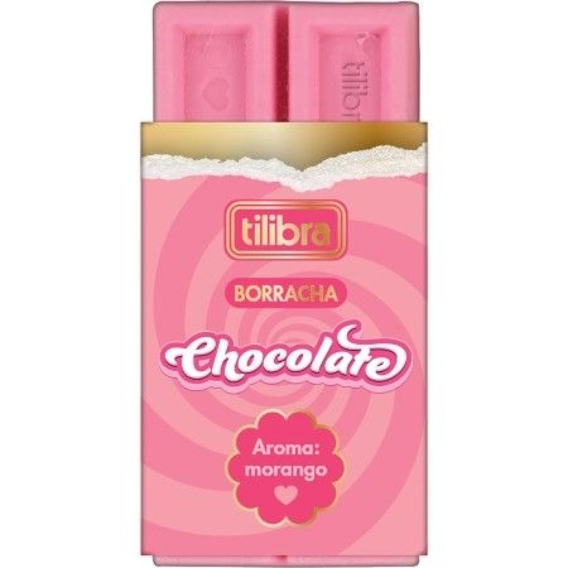 "Seus estudos podem ficar deliciosamente divertidos com a Borracha de Chocolate da Tilibra. Fabricada com alta qualidade, esta borracha possui um agradável aroma de chocolate (cor marrom) ou morango (cor rosa), tornando o momento de apagar fora do convencional.