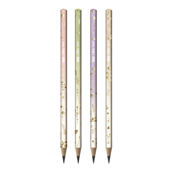 Uma tendência que nunca sai de moda, o floral está em alta com uma abordagem romântica e poética. O mood Delicata explora cores claras e transparência, dedicado à delicadeza e à naturalidade das flores. O lápis grafite Fiori possui corpo em degradê e estampa floral dourada! São 4 modelos super delicados, corpo em madeira e formato redondo.